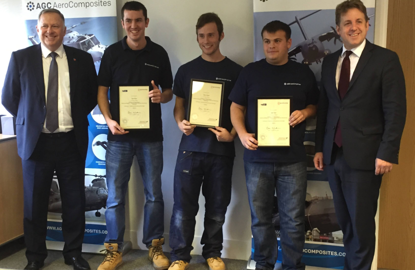 Marcus Fysh MP was invited to attend the graduation of 3 Engineers from apprenticeships run by AGC AeroComposites and Yeovil College. The 3 engineers, James Brown, Joshua Goodall and Adam Davis, started the apprenticeships 4 years ago. Marcus said "Apprenticeships are something to be valued. Not all skills development opportunities come via academia, and there is tremendous value in proper technical skills. I continue to support the Government's vision for up to 3 million new apprenticeships and am encouraging more investment for Yeovil College to be part of that."